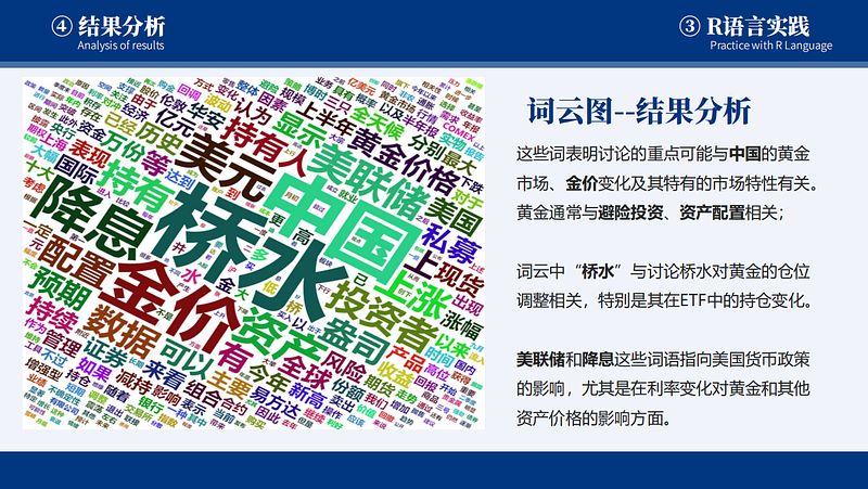 The resulting word cloud highlights that discussions predominantly centered on the Chinese gold market and fluctuations in gold prices. Frequently occurring terms such as “gold,” “gold price,” “Bridgewater,” “Federal Reserve,” and “interest rate cut” indicate that market participants closely monitor macroeconomic factors and institutional movements influencing gold market dynamics.