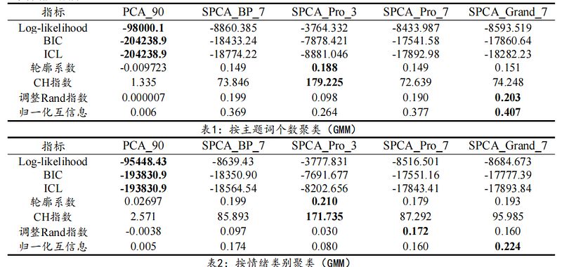 When clustering keywords, SPCA_Pro_3 achieves the highest silhouette coefficient of 0.188, indicating a clear clustering structure. SPCA_Pro_3 achieved the highest CH index (the ratio of within-class variance to between-class variance) at 179.225, indicating strong clustering results. A higher adjusted Rand index is preferred, as it measures the consistency between clustering results and the true classifications. SPCA_Pro_7 achieved the highest Rand index at 0.203, and SPCA_Grand_7 achieved the highest NMI at 0.407, indicating relatively consistent classification information in their clustering results. When targeting emotion classification, similar results were achieved, with the exception of SPCA_Pro_3, which achieved the highest Rand index at 0.197.